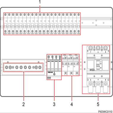 (1)整流模块的交流输入空开 (2)N 接线排 (3)交流防雷器 (4)防雷器空开 (5)交流输入空开
